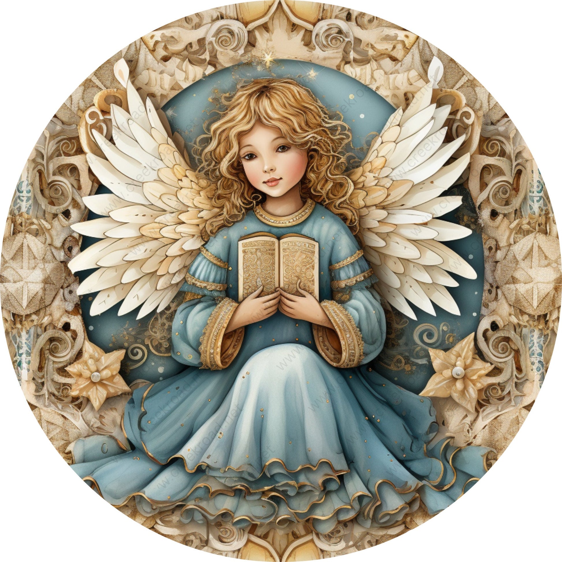 Christmas Angel Blue Gold Dress Wreath Sign-Sublimation-Round-Chistmas-Winter-Decor
