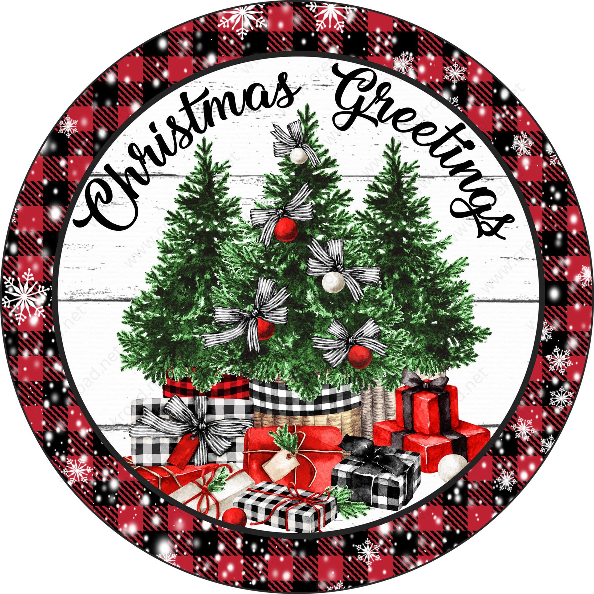 Christmas Greetings Trees with Presents Gingham Snow Border Wreath Sign-Sublimation-Round-Chistmas-Winter-Decor