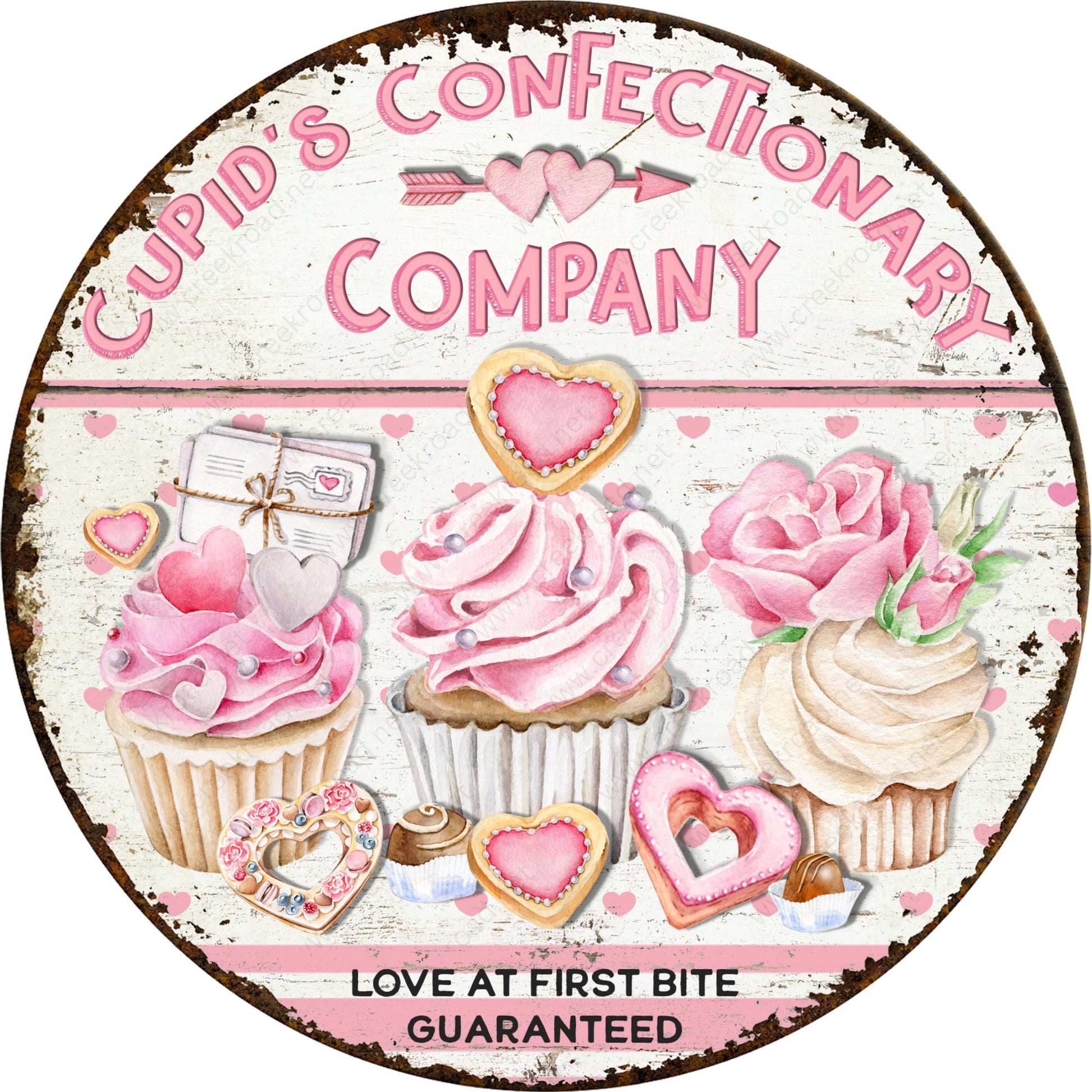 Cupid's Confectionary Company Love At First Bite Guaranteed-Wreath Sign-Aluminum-Valentines-Decor