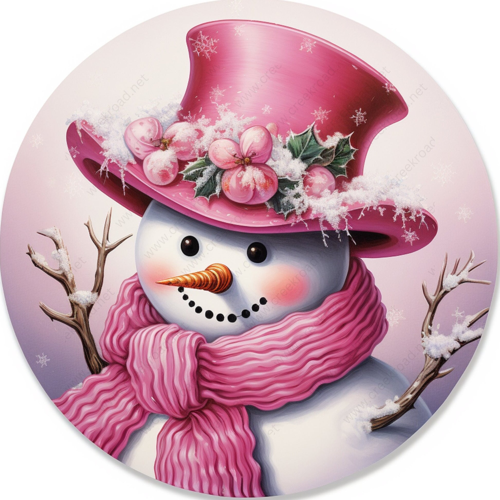 Pink Mrs. Snowman Scarf Top Hat Wreath Sign-Sublimation-Round-Christmas-Winter-Decor