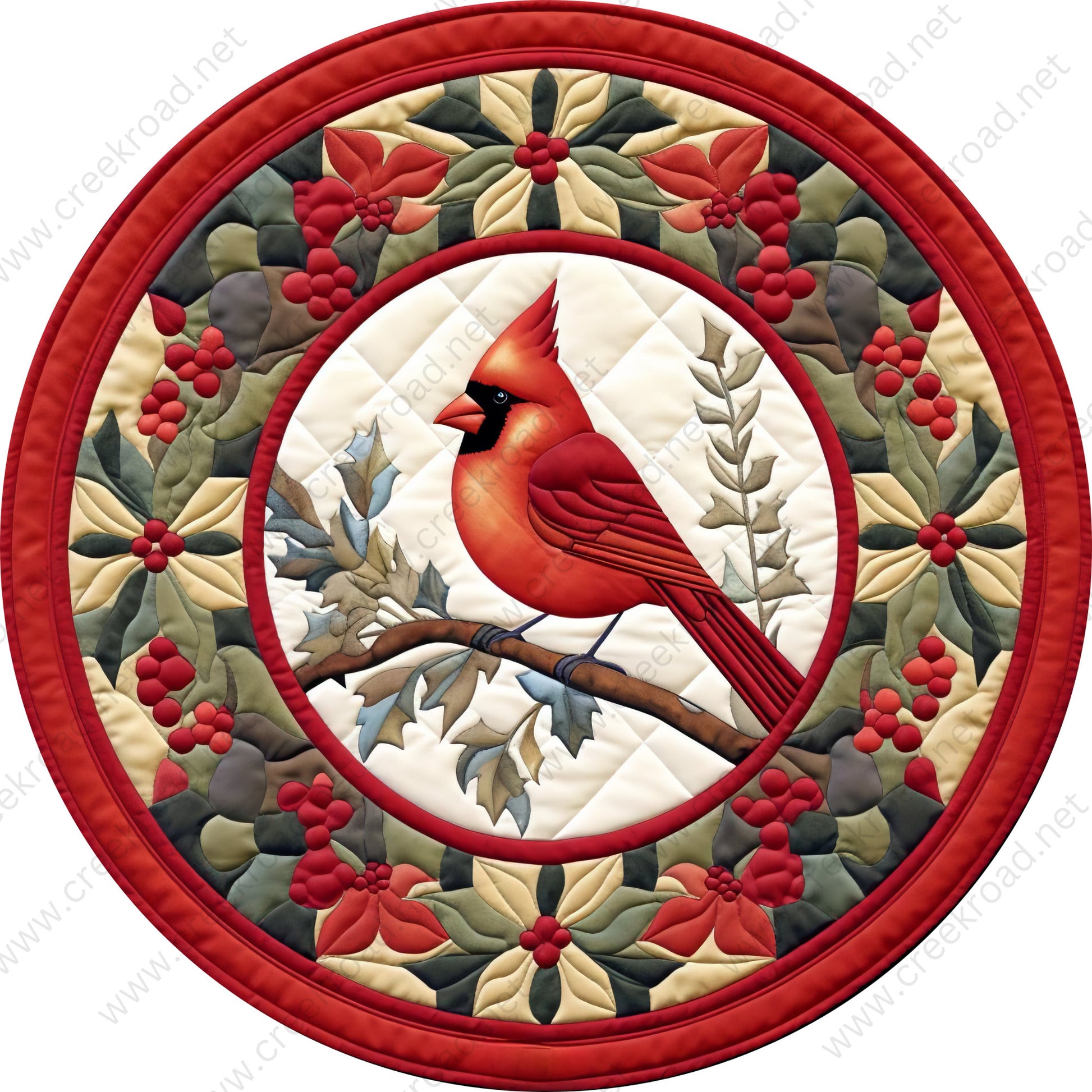 Red Christmas Cardinal Holly Border Faux Quilted Appearance Wreath Sign-Holiday-Sublimation-Attachment-Decor