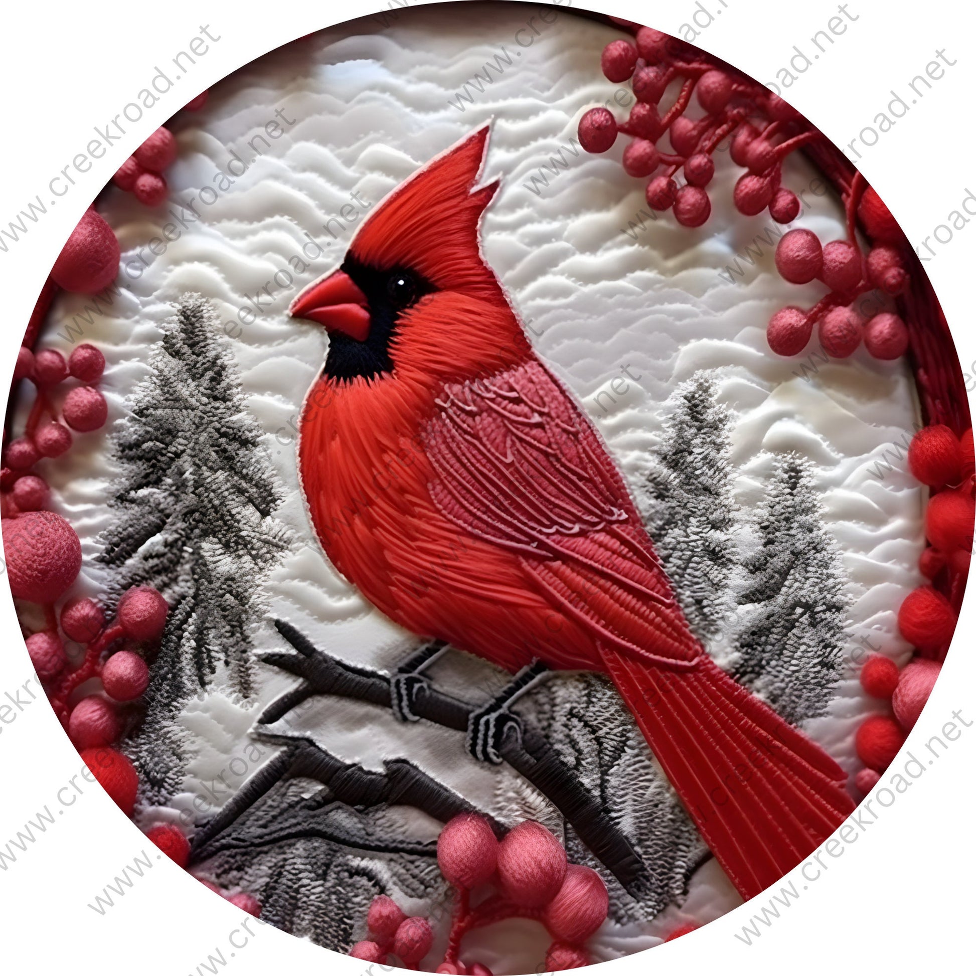 Red Christmas Cardinal Quilted Appearance Wreath Sign-Sublimation-Round-Christmas-Decor