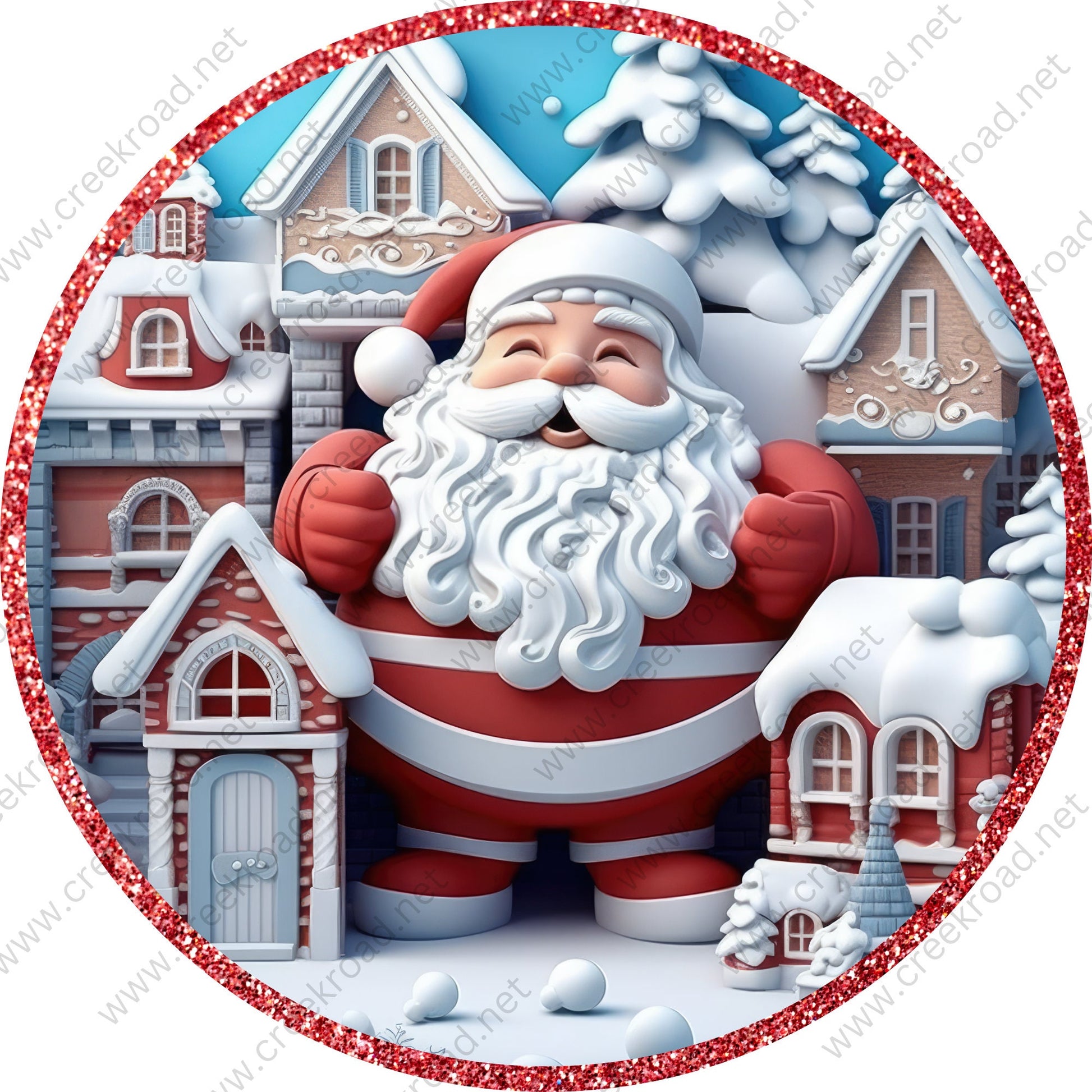 Santa Claus Laughing in Christmas Village Red Glitter Border Wreath Sign-Holiday-Sublimation-Attachment-Decor