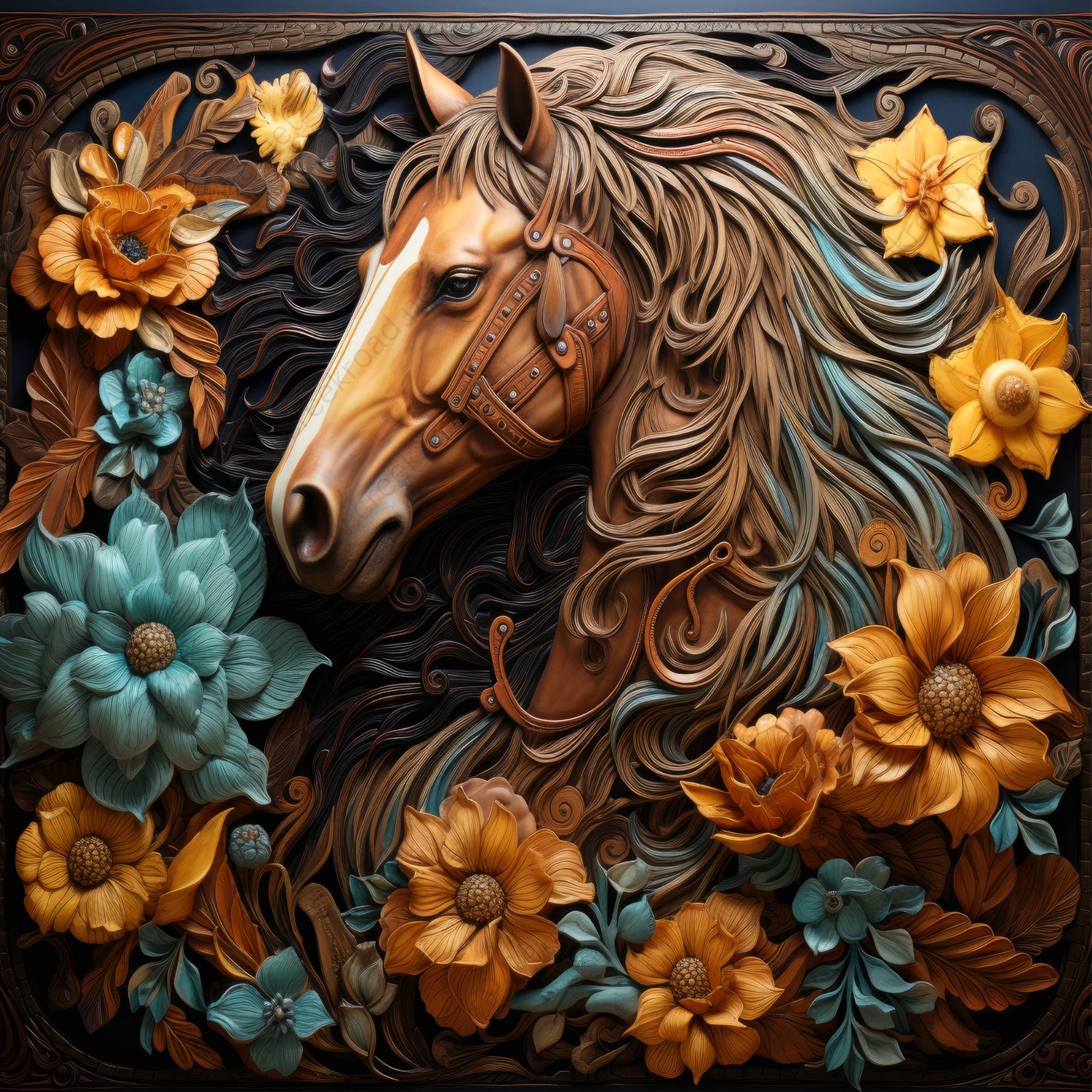 Western Horse Teal Tan Yellow Flowers Tooled Leather Appearance Wreath Sign-10" x 10" Square-Sublimation-Round-Summer-Decor