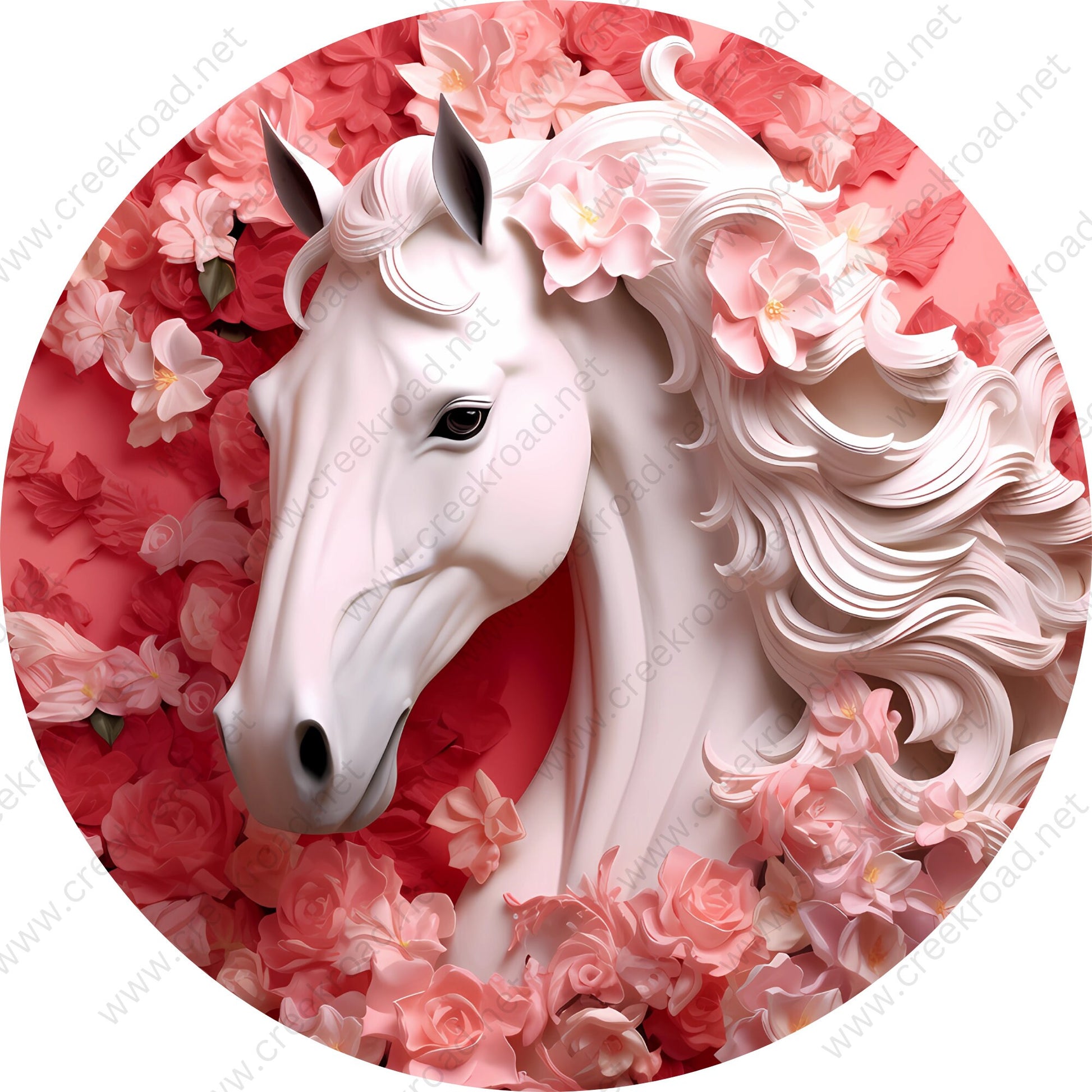 White Horse with Pink Flowers -3D-Wreath Sign-Round-Sublimation-Fall-Decor-Creek Road Designs